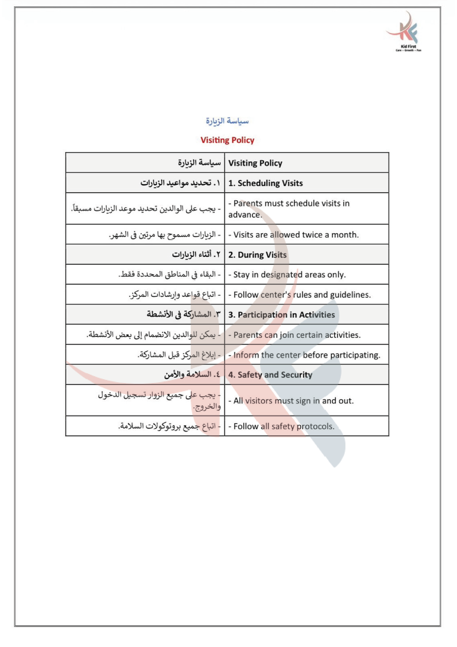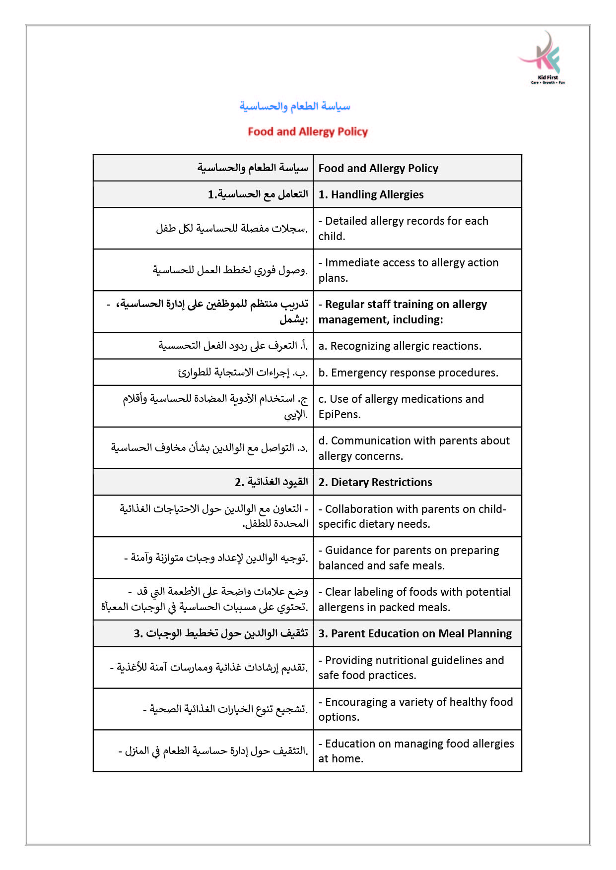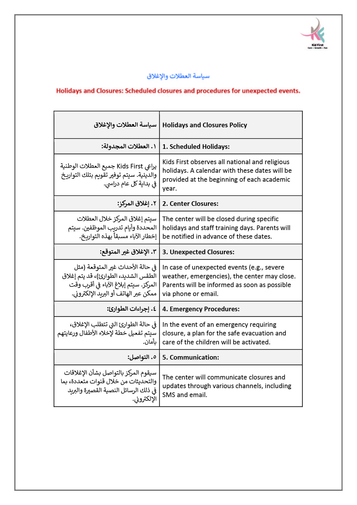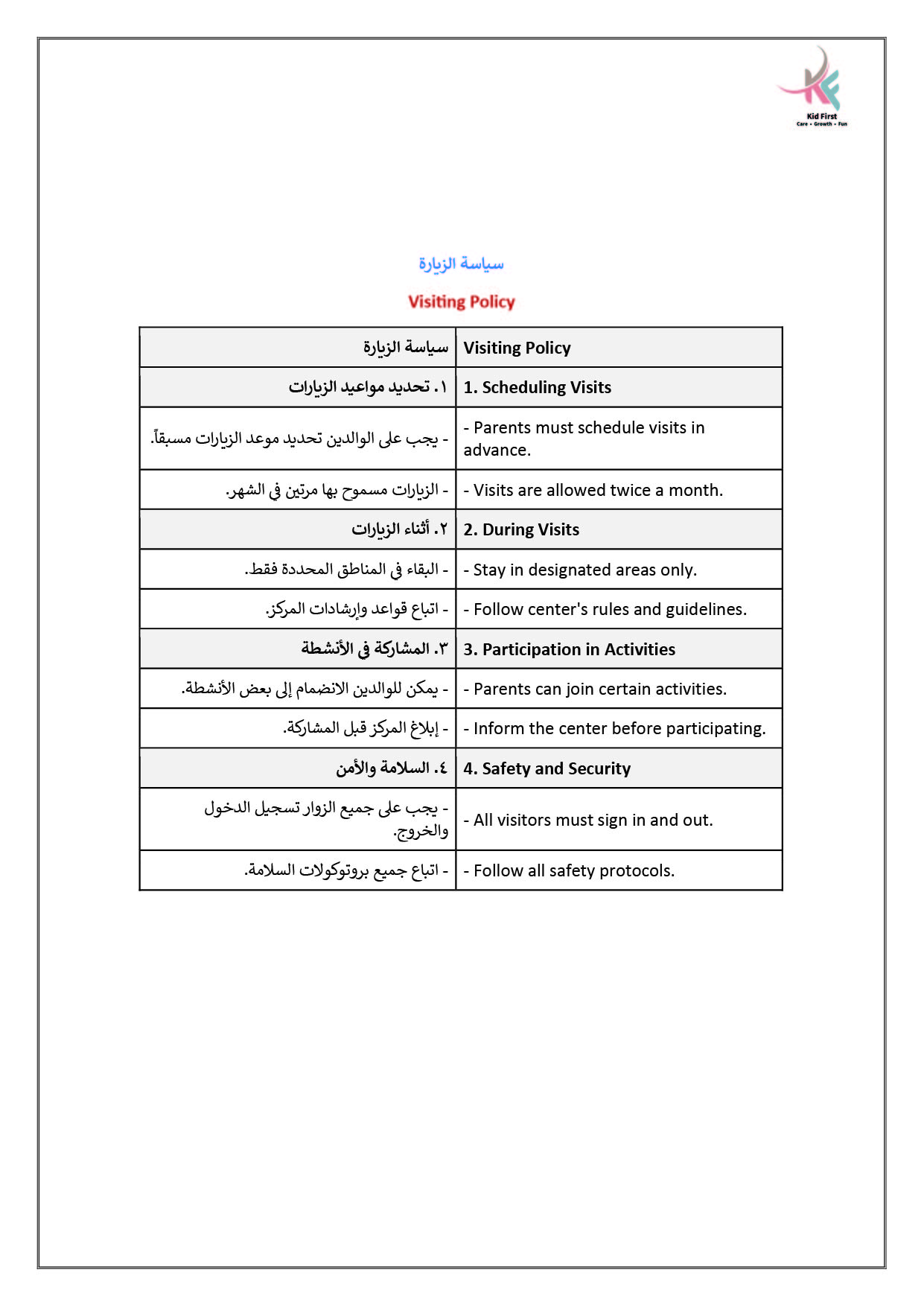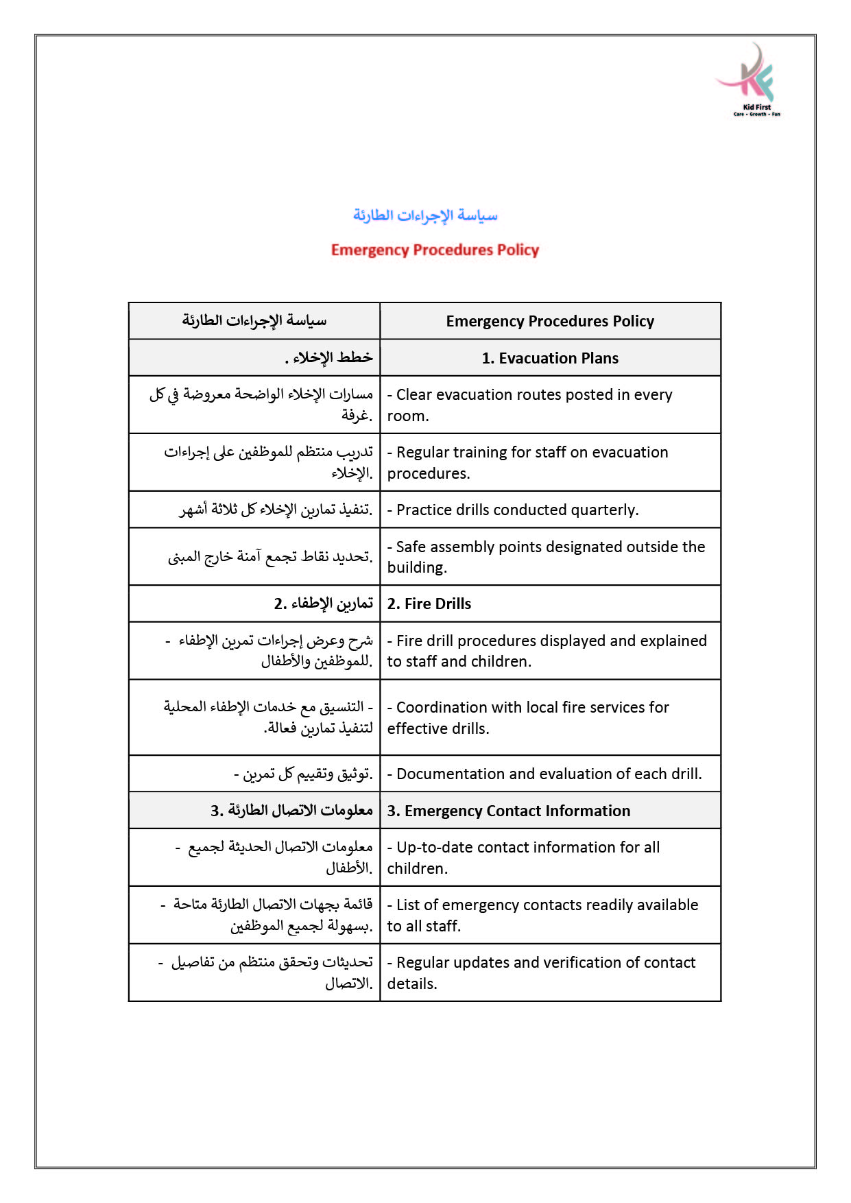 نـدرك في كيد فرست أهمية التعاون لحصد ثمار النمو والإبداع، لذا نتعــاون بشكل متكـامـل مـع عائلات الأطفال في سبيل تعزيز رعاية الأطفــال وتنميـة مهـاراتهـم، ومن جهـةٍ أخرى نتعاون معاً كفريق عمل لتطــويـع مهـاراتـنا وشغفنـا في توفيــر بيئة مميزة وملائمة للتعلم والاستمتاع والتفاعل.