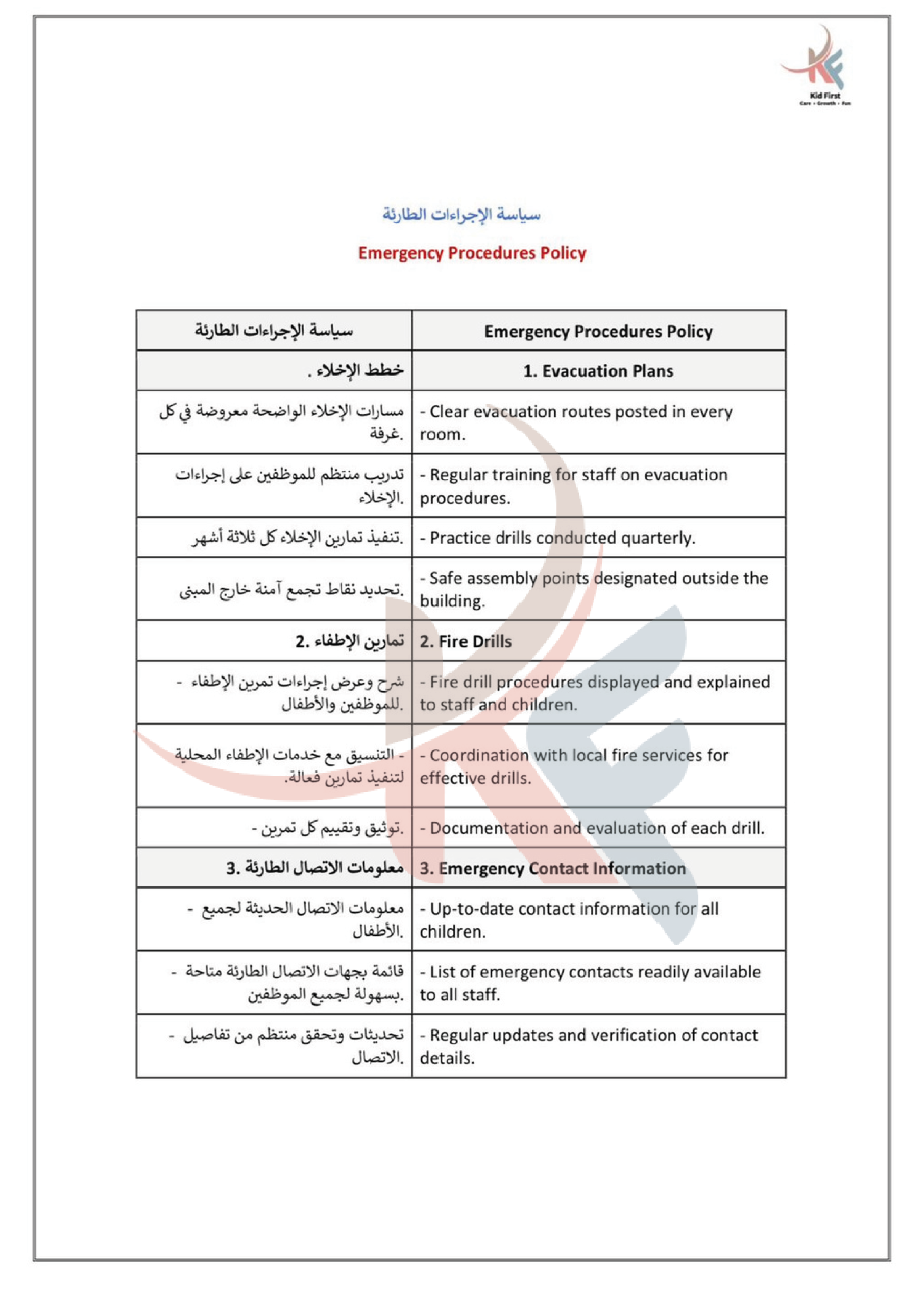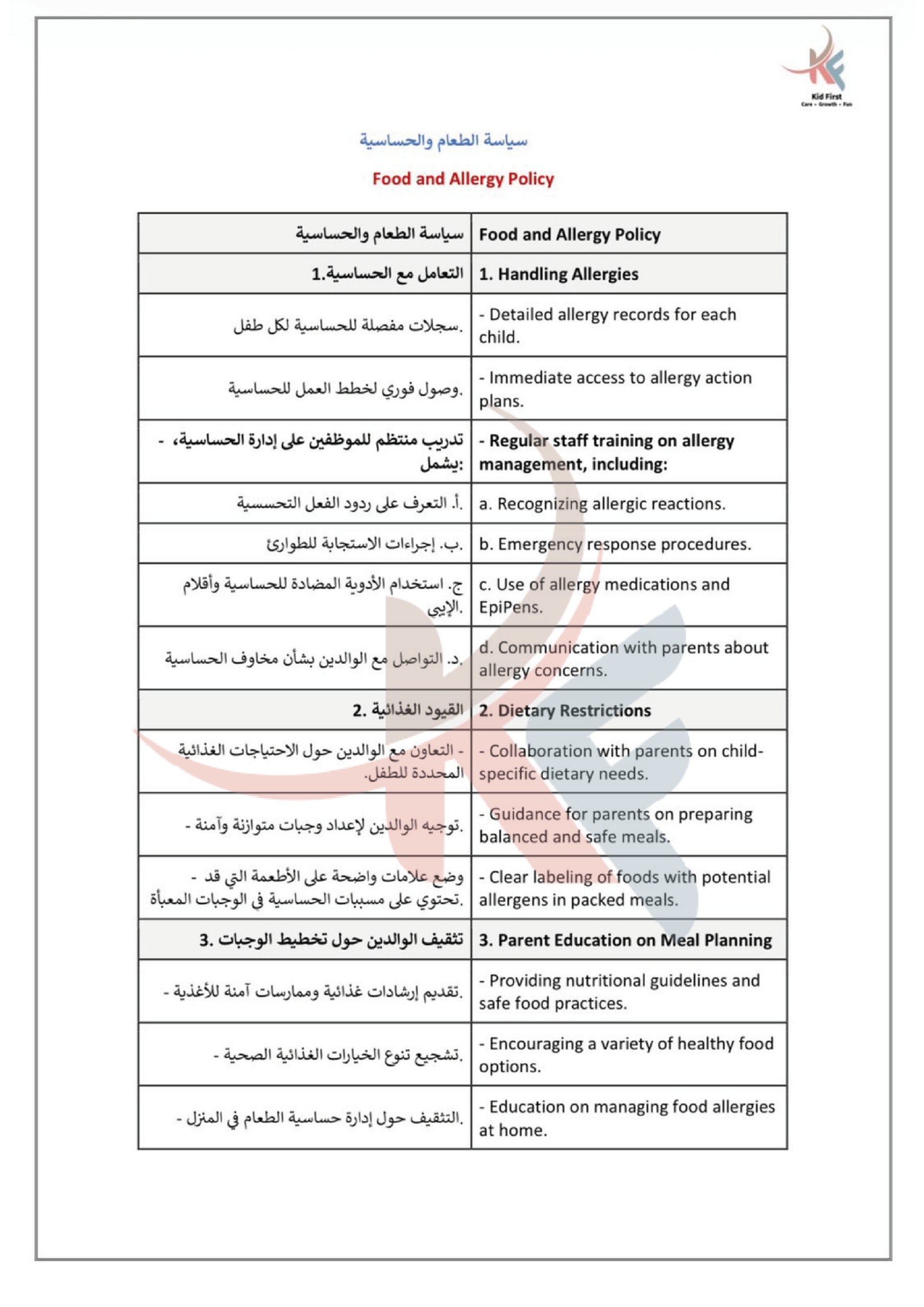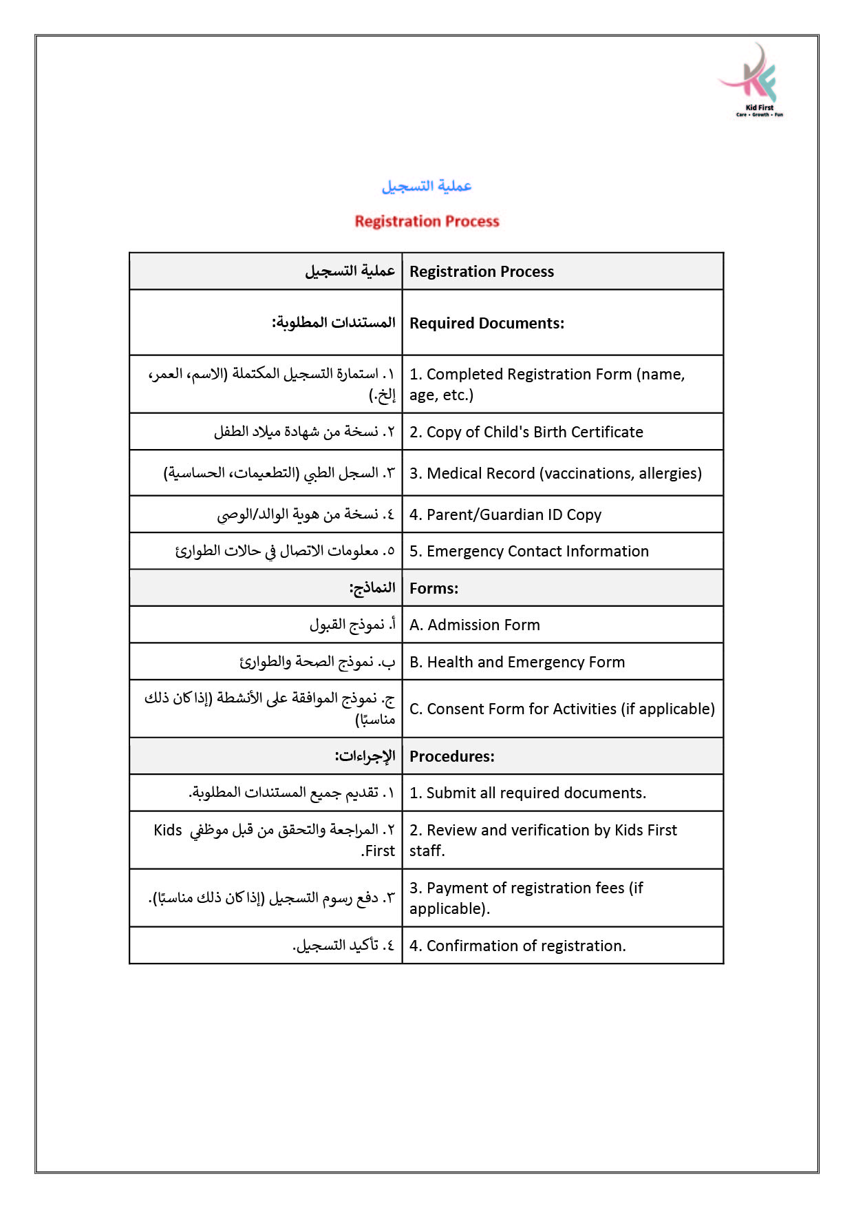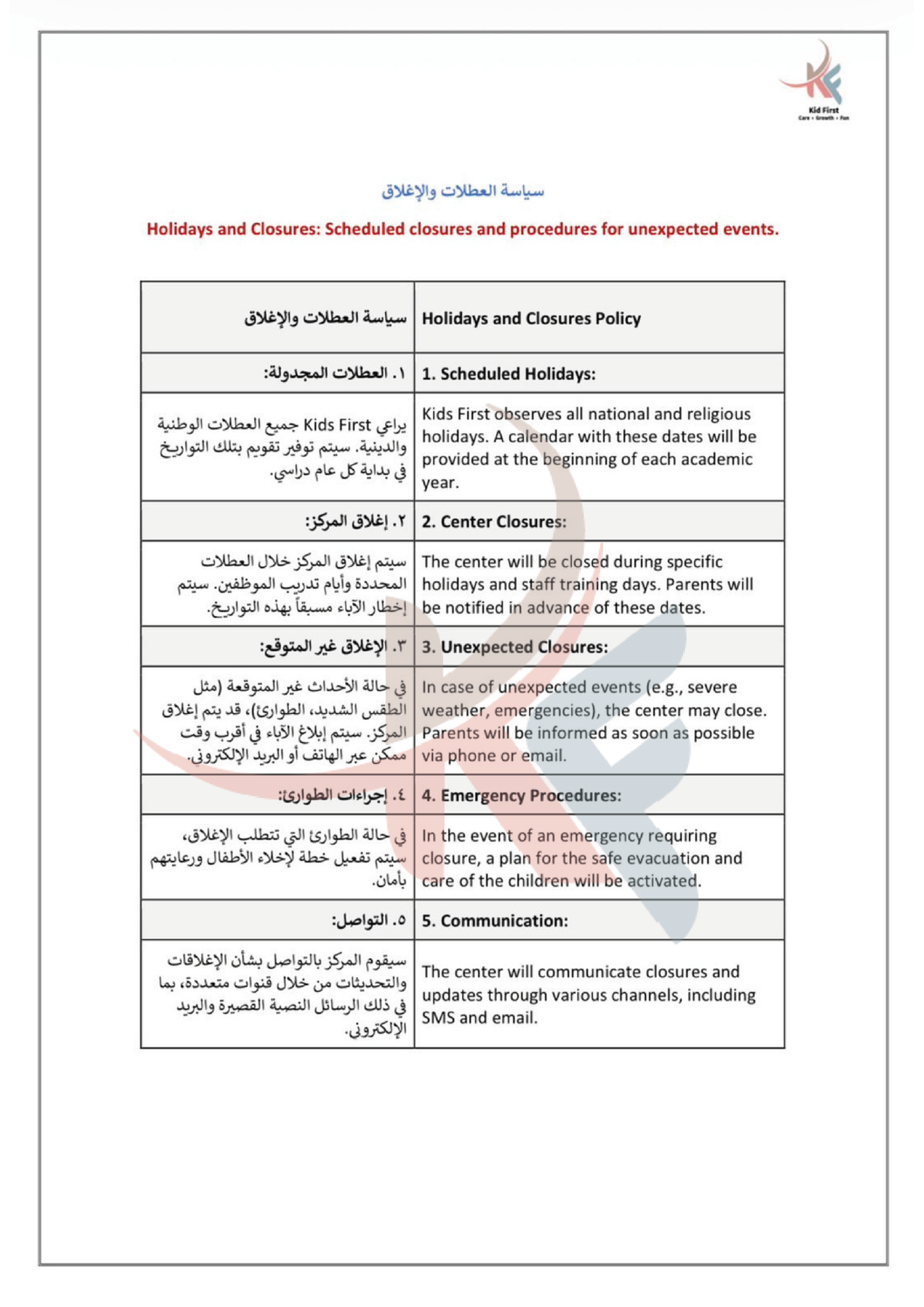 نـدرك في كيد فرست أهمية التعاون لحصد ثمار النمو والإبداع، لذا نتعــاون بشكل متكـامـل مـع عائلات الأطفال في سبيل تعزيز رعاية الأطفــال وتنميـة مهـاراتهـم، ومن جهـةٍ أخرى نتعاون معاً كفريق عمل لتطــويـع مهـاراتـنا وشغفنـا في توفيــر بيئة مميزة وملائمة للتعلم والاستمتاع والتفاعل.