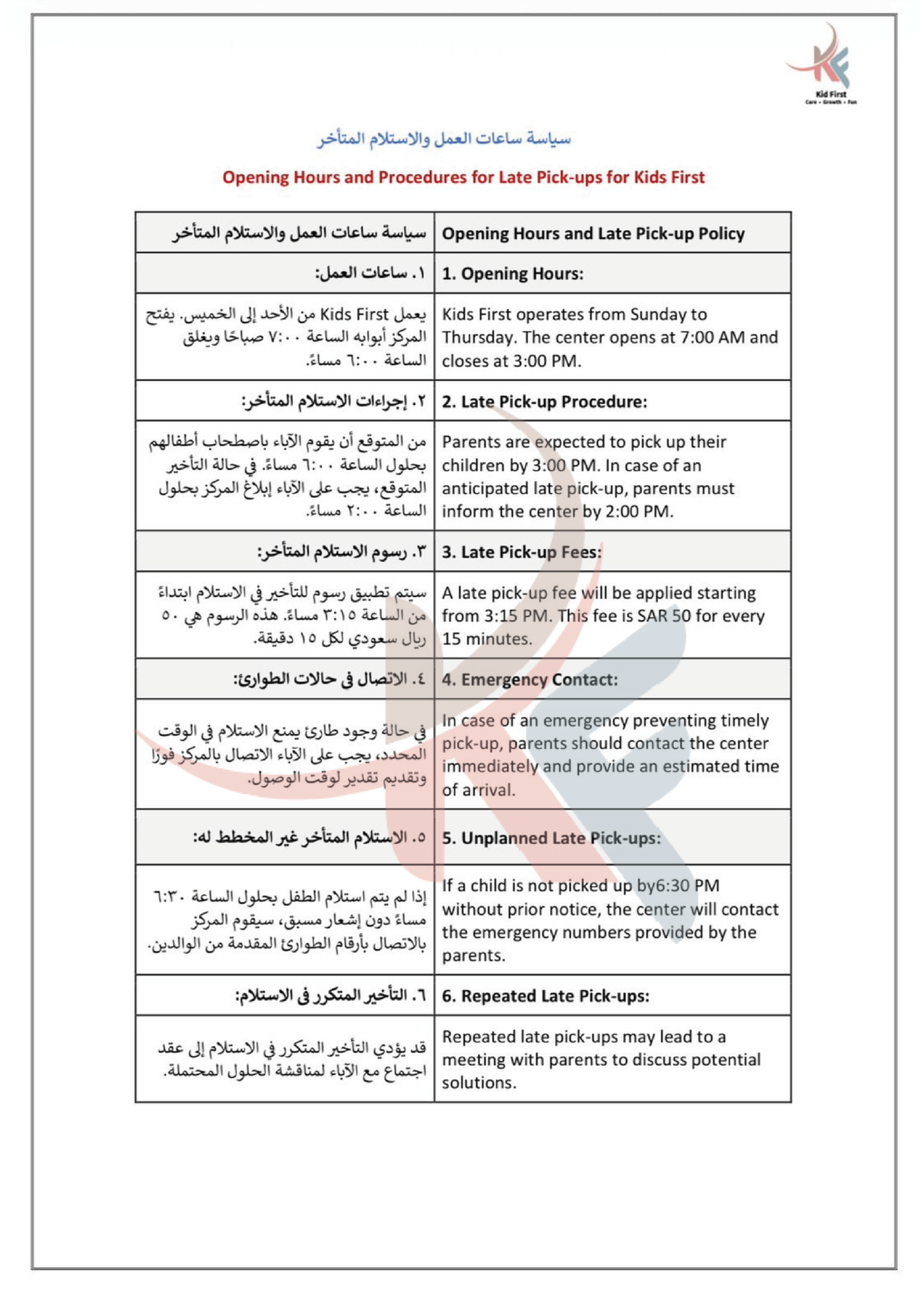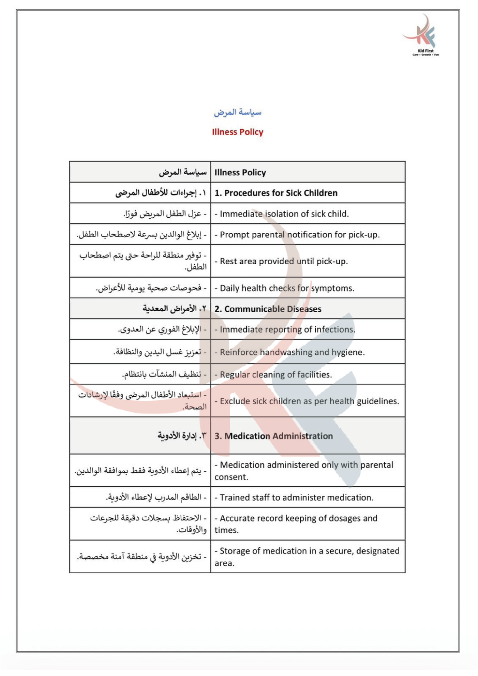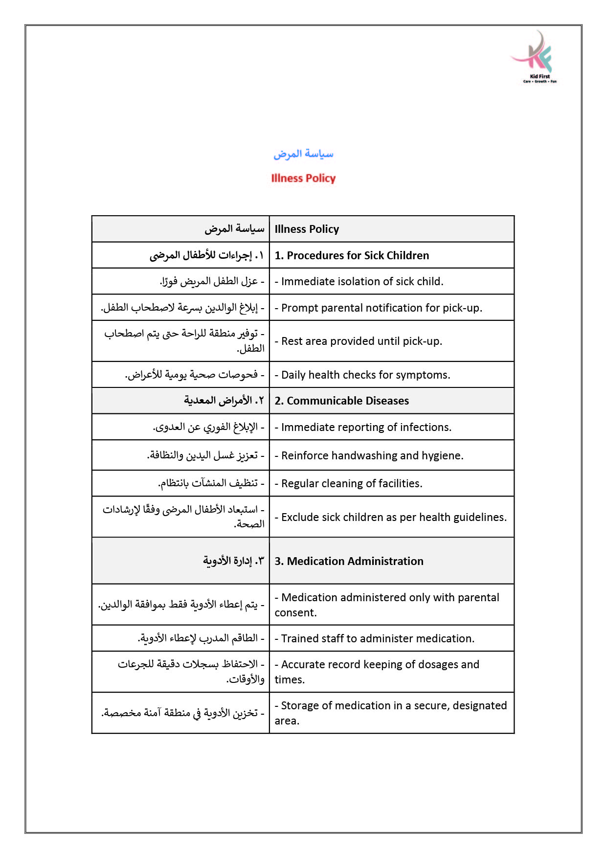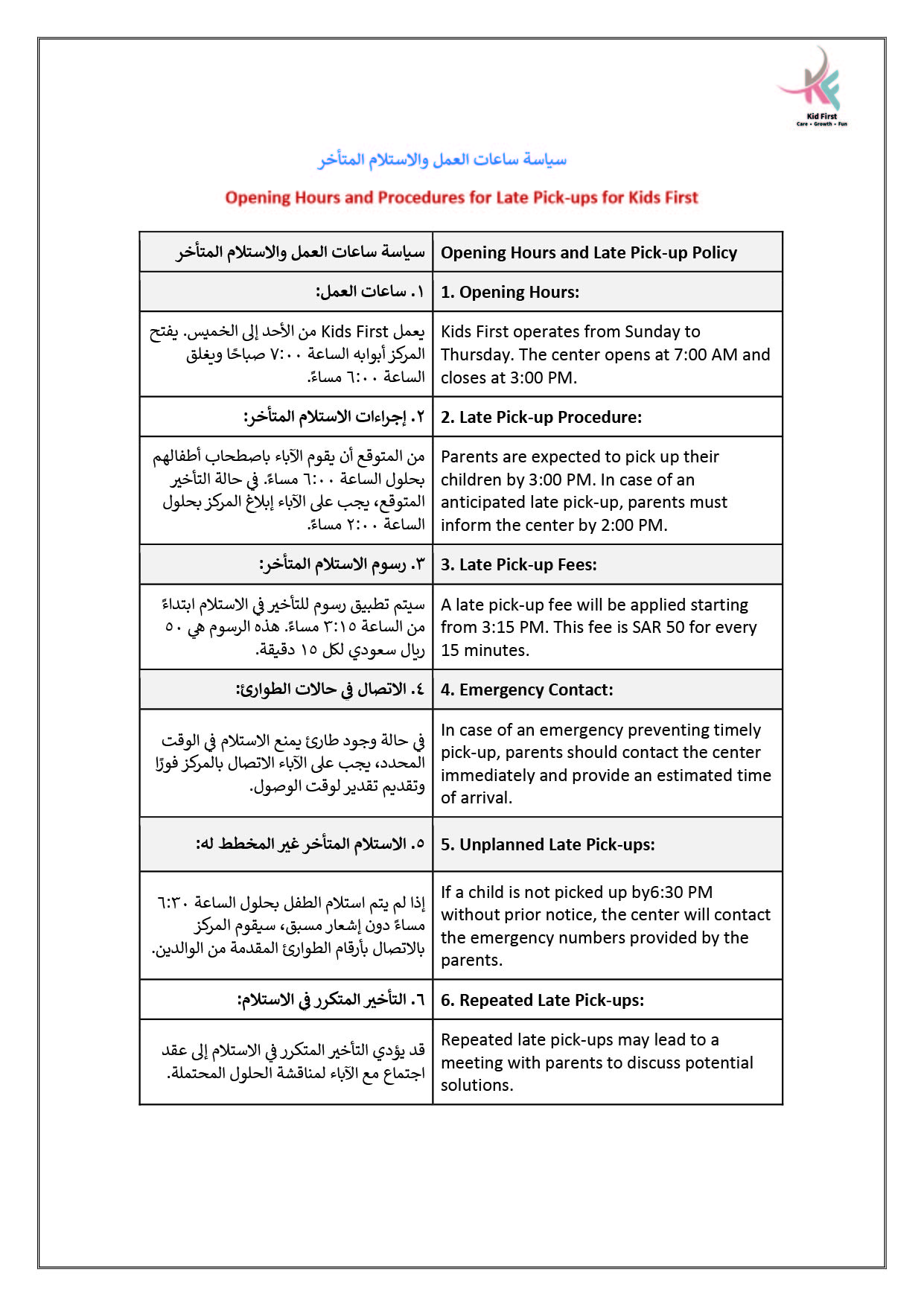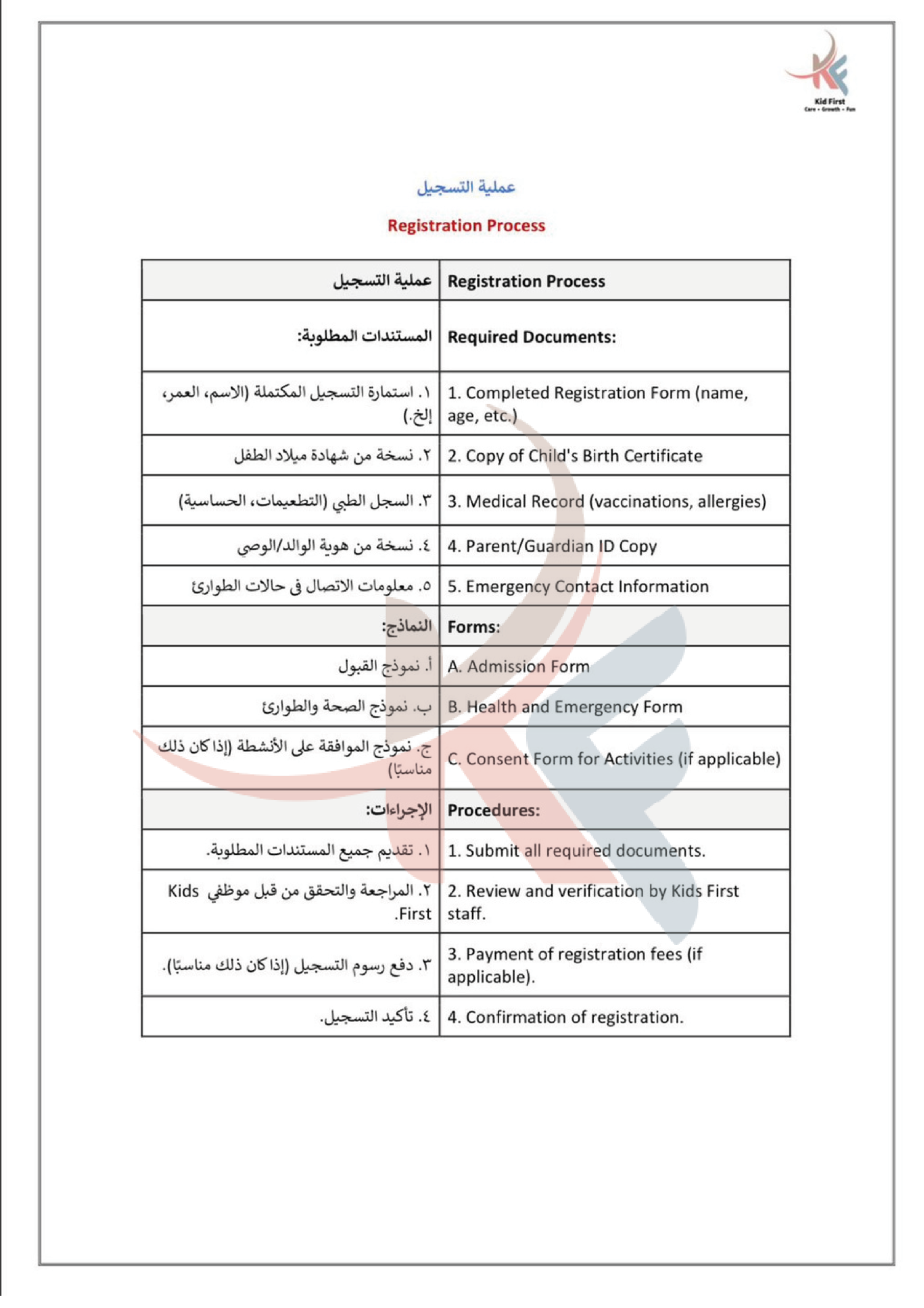 نـدرك في كيد فرست أهمية التعاون لحصد ثمار النمو والإبداع، لذا نتعــاون بشكل متكـامـل مـع عائلات الأطفال في سبيل تعزيز رعاية الأطفــال وتنميـة مهـاراتهـم، ومن جهـةٍ أخرى نتعاون معاً كفريق عمل لتطــويـع مهـاراتـنا وشغفنـا في توفيــر بيئة مميزة وملائمة للتعلم والاستمتاع والتفاعل.